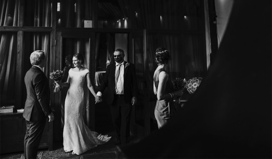 "My dad arrived around 10.30 and we left the house and headed to Bix Manor in Henley on Thames for 12.30. Once we arrived, our photographer Jay and the event manager Jude from Bix Manor came out to greet us. As we weren't allowed to walk down the aisle, we managed to get away with a reveal. I walked from the end of the barn through curtains with my dad and into the reception area where everyone was waiting to greet us along with a huge blazing fire."