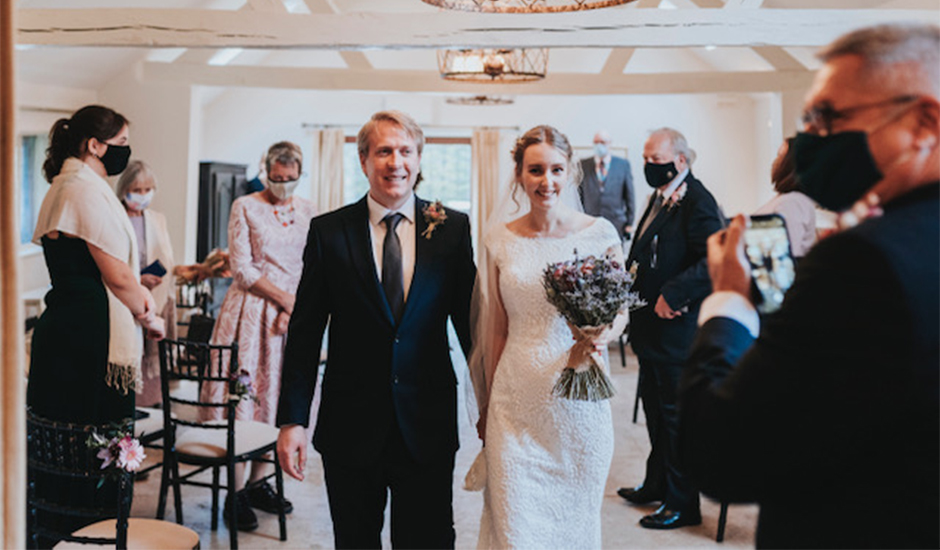 "Everyone was seated in family groups during the ceremony. It was strange to see our family wearing masks during the ceremony but its something to look back on and say 'Yeah, we got married during a pandemic, thats why everyone is wearing masks'. Once the ceremony finished, we went off with our photographer and had photos taken out in the gardens, and then we came back into the barn and had group photos done. Once the photographs were finished we then sat down for a small lunch of 4 canapés each and small portions of 3 different bowl foods. Of course we ended with the cake!"