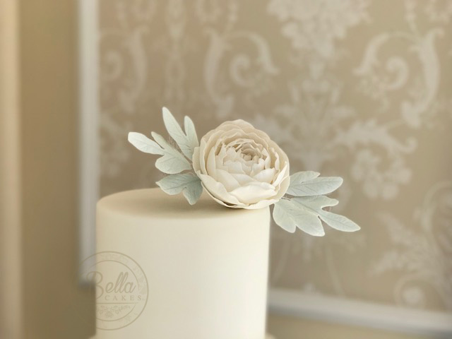 This elegant, white 2 tiered wedding cake looked stunning set in the Eastington Park venue. A delicate, edible silver leaf finish to the bottom tier. With the most beautiful handmade closed peony sugar flower to match the brides bouquet. To make this cake more special to the couple, the cake stand was handmade by the brides father to complement the cake perfectly.