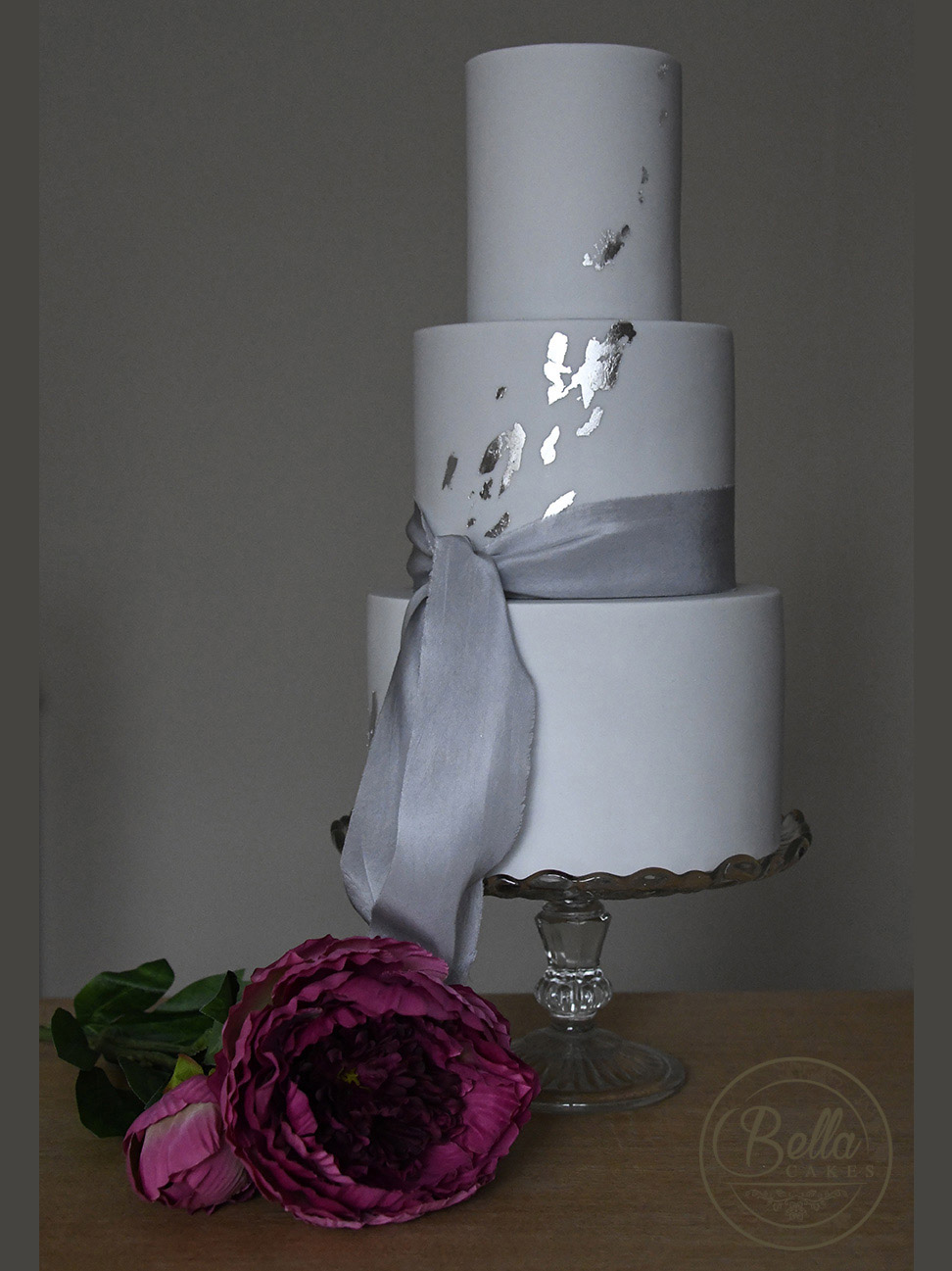 A 3 tier contemporary dove grey design for our 2019 collection. A touch of luxury with an edible silver leaf flume rising from the bottom tier to the top. Dressed with a Habitai hand dyed silk ribbon to complement this elegant design.