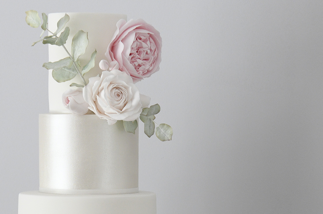 An elegant 5 tier wedding cake. A soft, blush pink second tier and a pearl white lustre finish for the fourth tier. A handmade Avalanche Rose and an English Rose with eucalyptus for the top tier and finished with an exquisite blush pink silk ribbon.