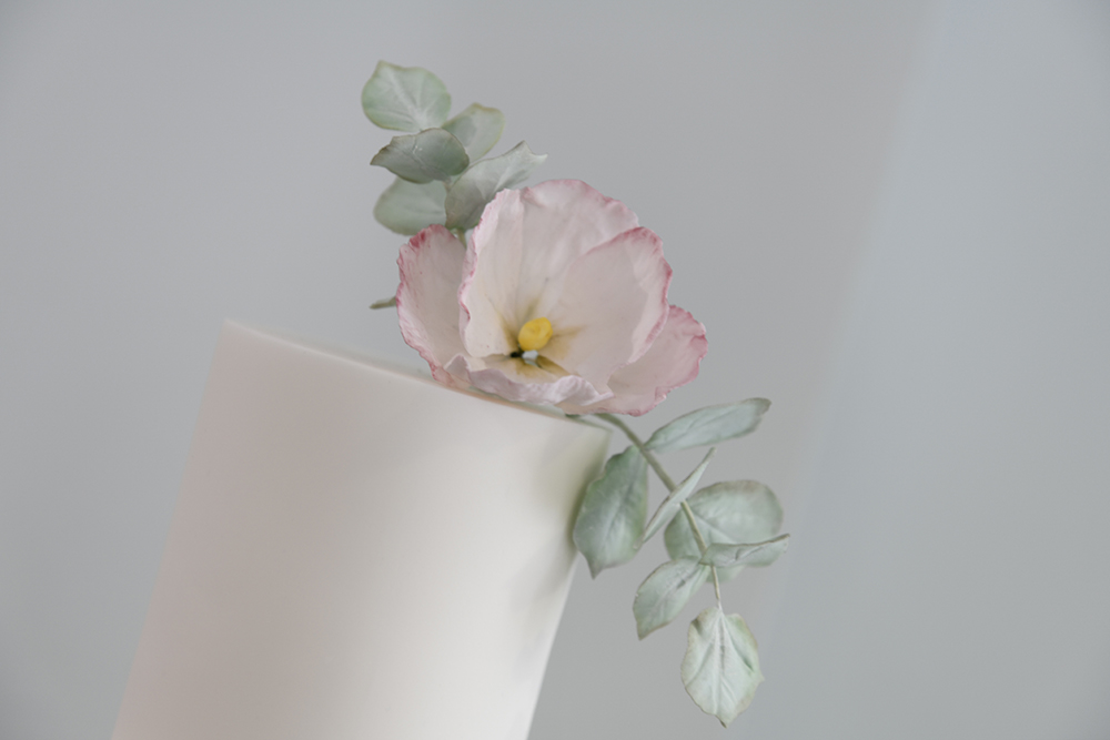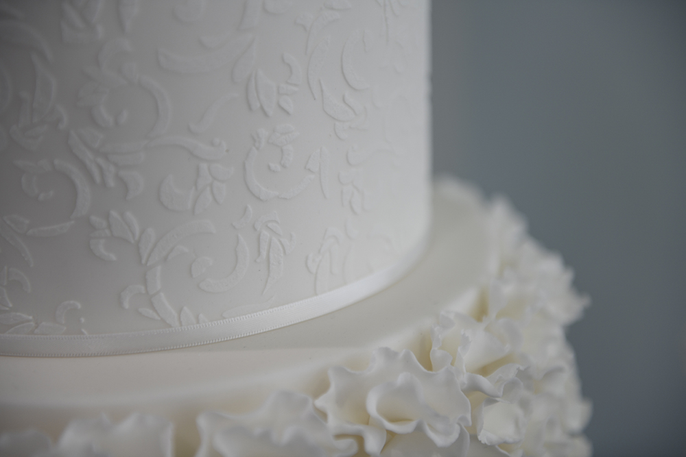 A stunning 4 tier wedding cake. Bottom tier comprises of over 300 individually handcrafted ruffles to create this striking cake. Sitting on the top is a beautifully handmade single statement flower finished with eucalyptus stems.