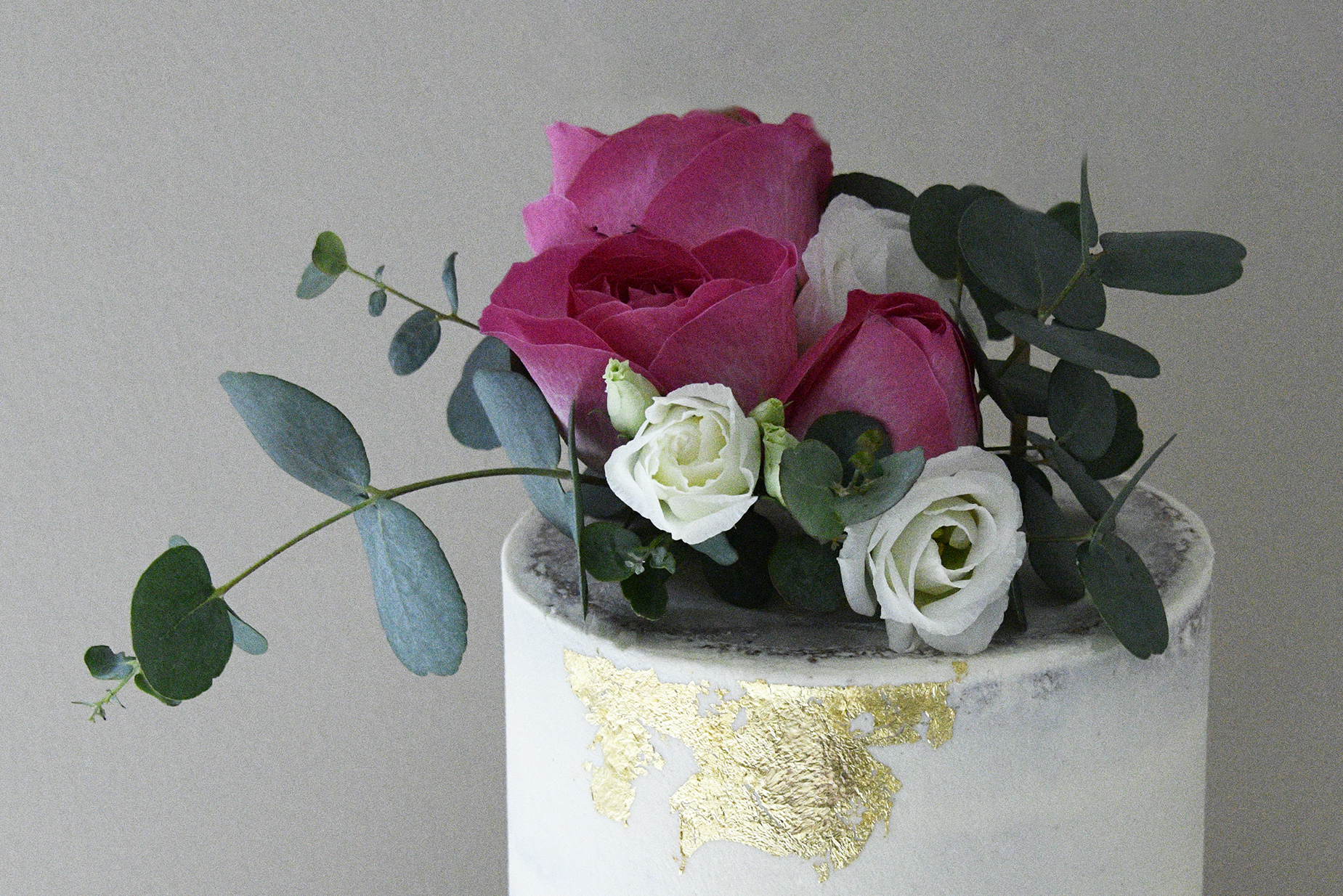 An elegant single tier semi-naked cake finished with edible gold leaf with fresh flowers and eucalyptus stems. Perfect for those smaller, intimate weddings