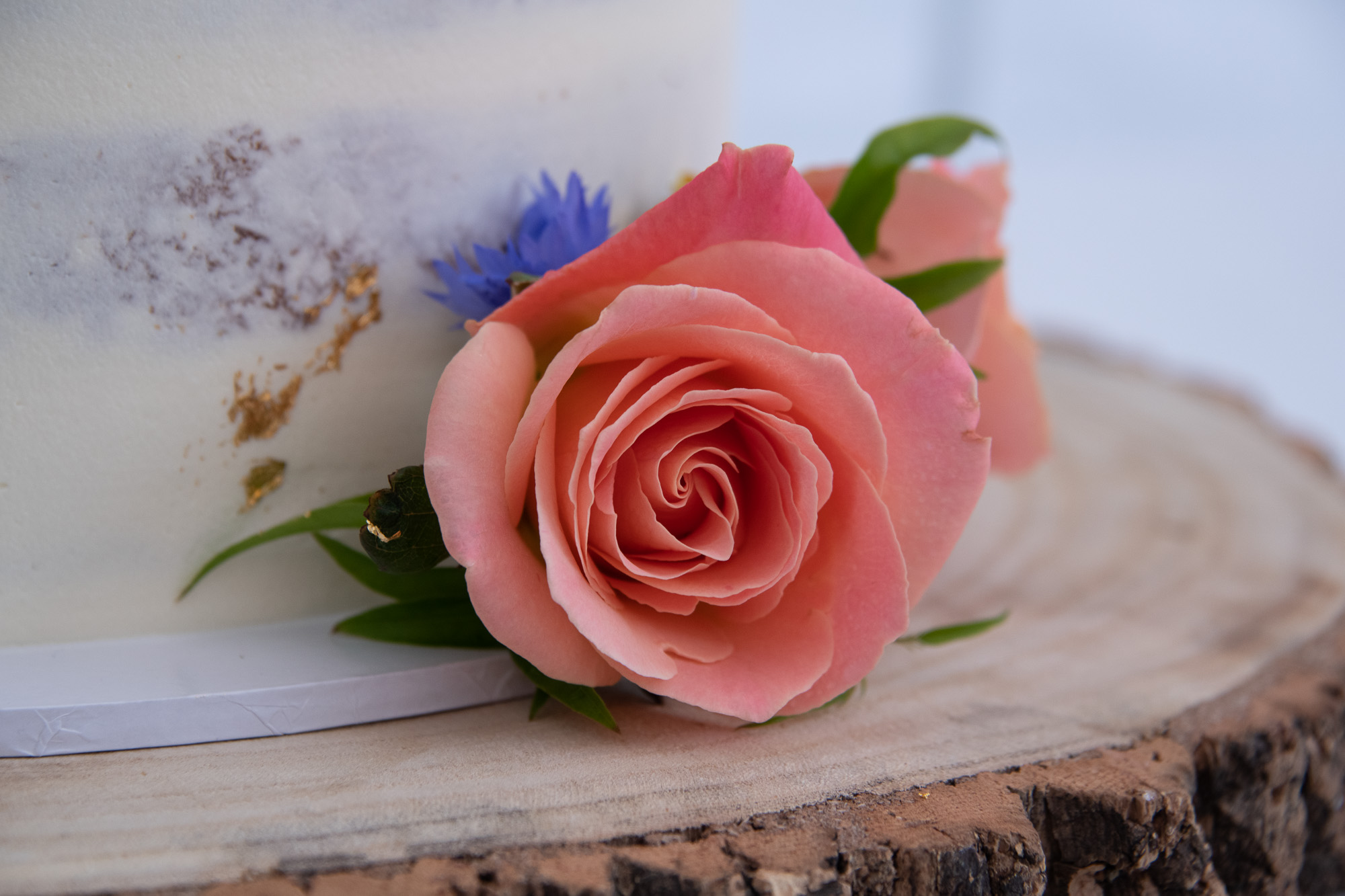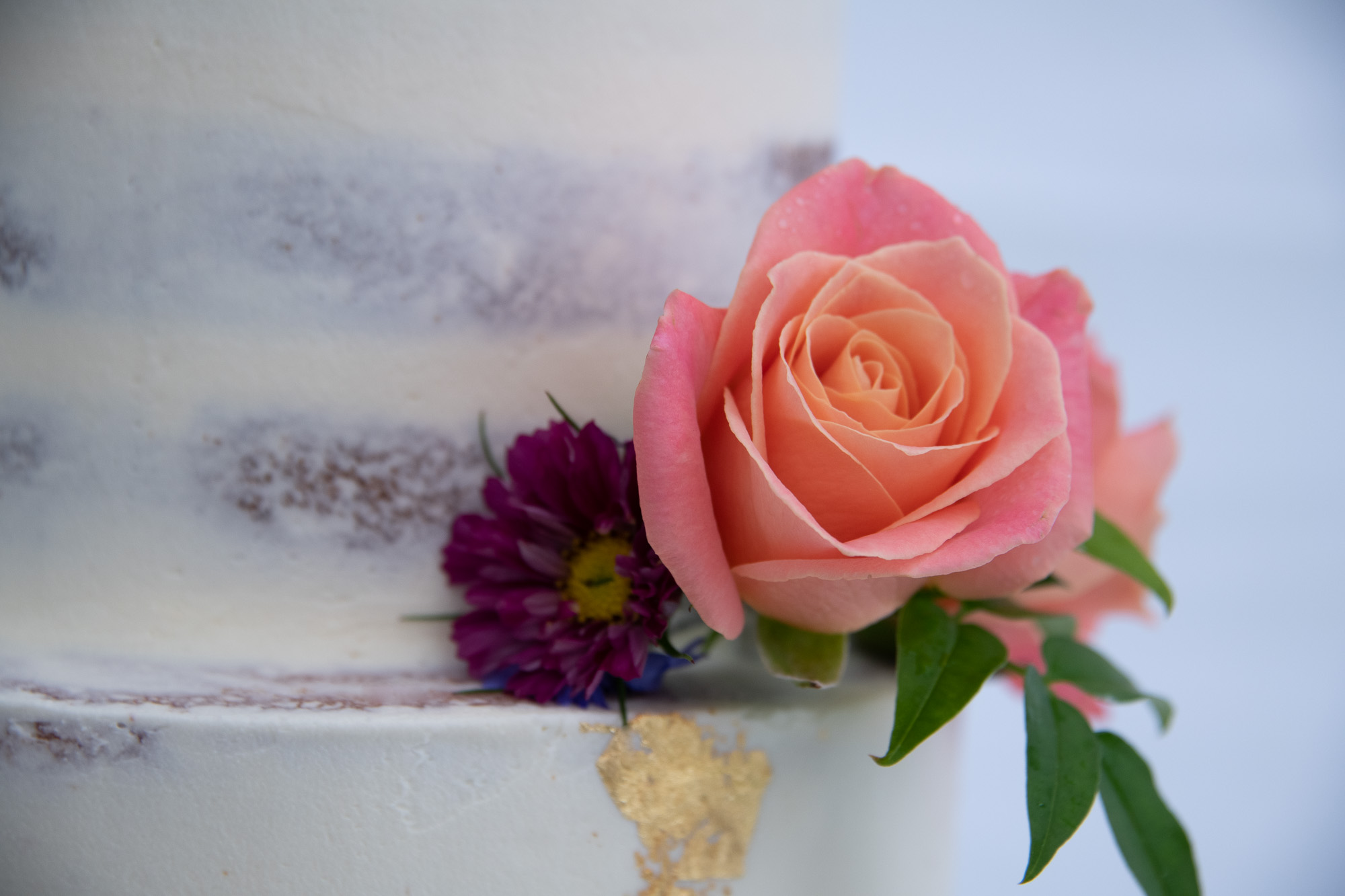A beautiful 3 tier semi-naked cake with gorgeous florals of 'Miss Piggy' roses and a pop of blue with a decadent touch of 24K edible gold leaf.Perfect for the country house or barn wedding venue.