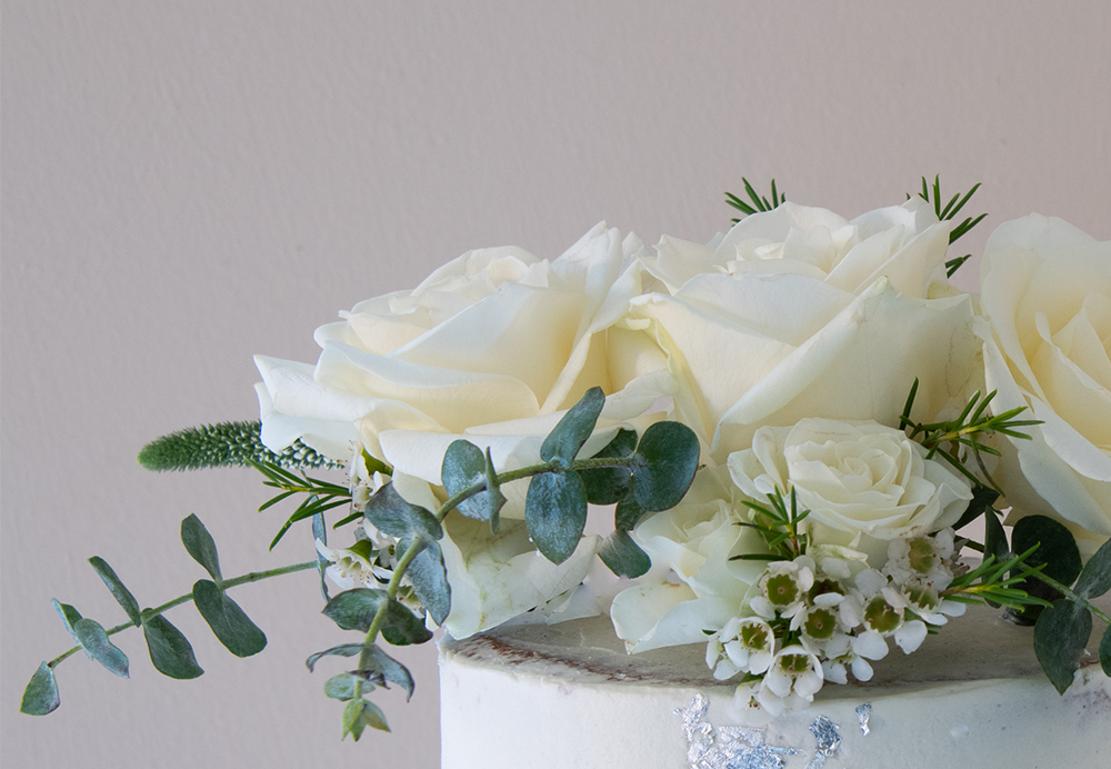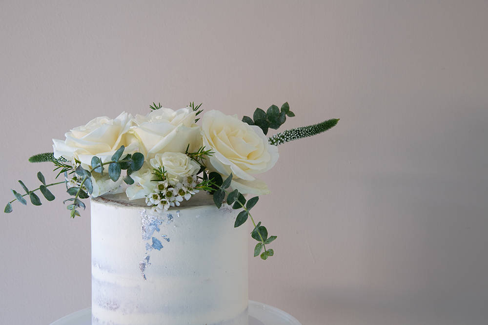 A beautiful single tiered wedding cake with elegant green and white fresh flowers finished with a touch of edible silver leaf.
