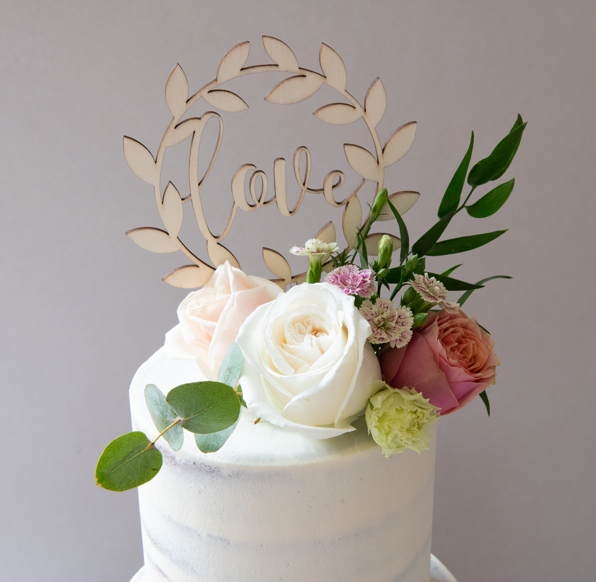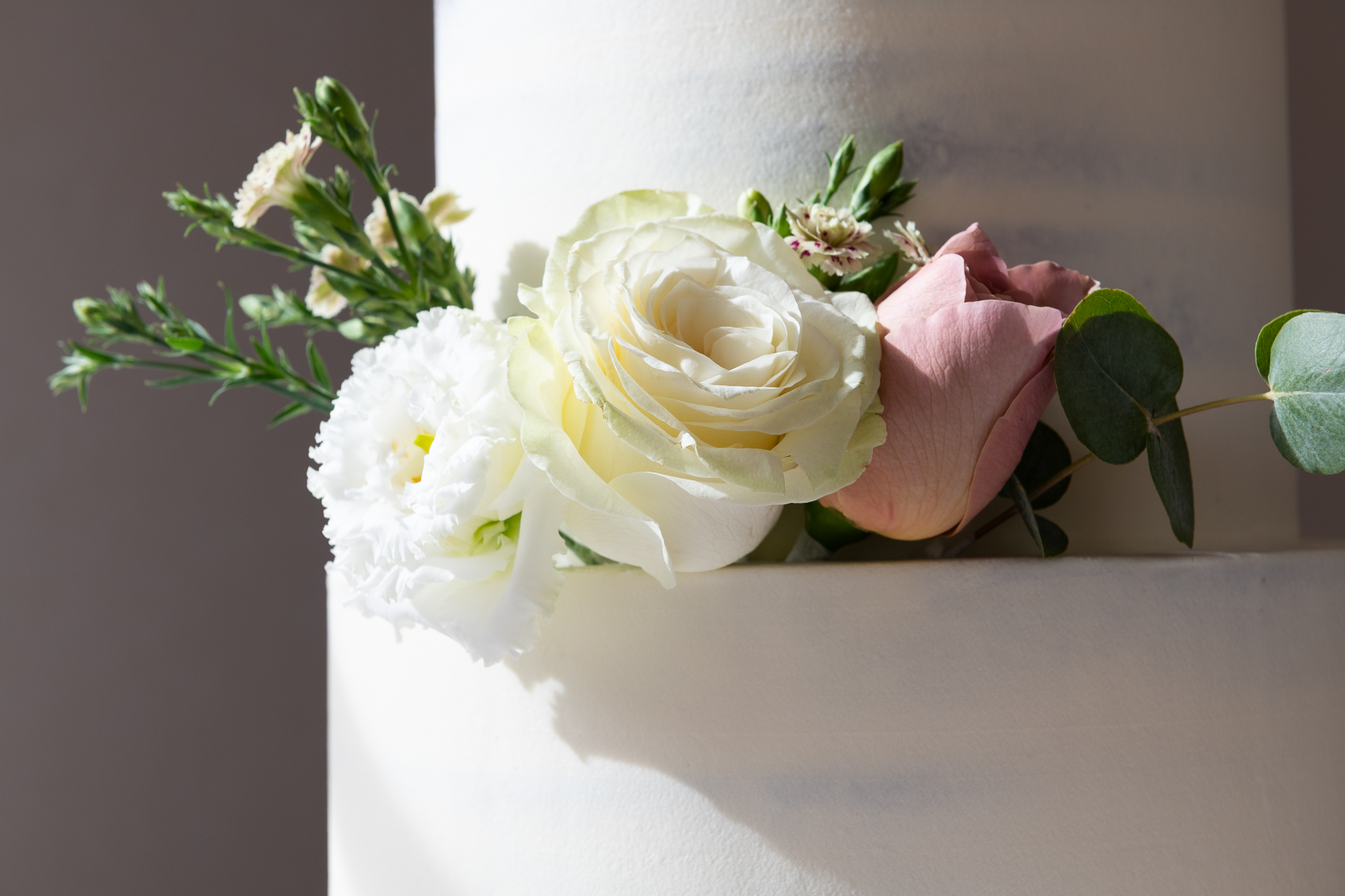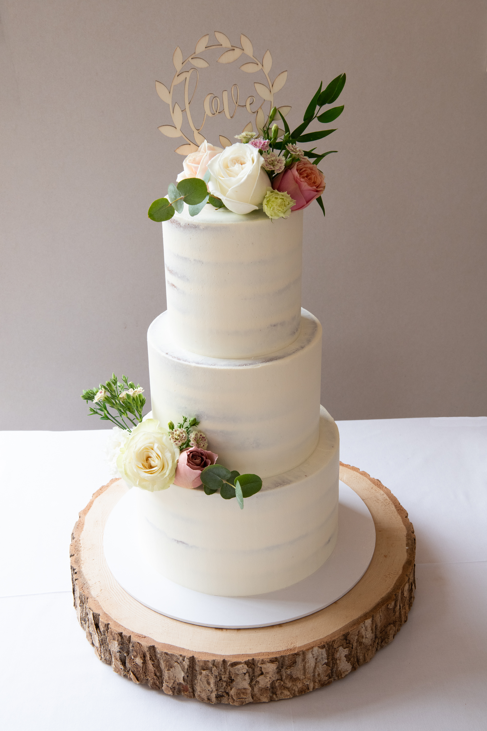 A romantic three tiered semi-naked cake with a beautiful selection of flowers including the delightful mocha roses.