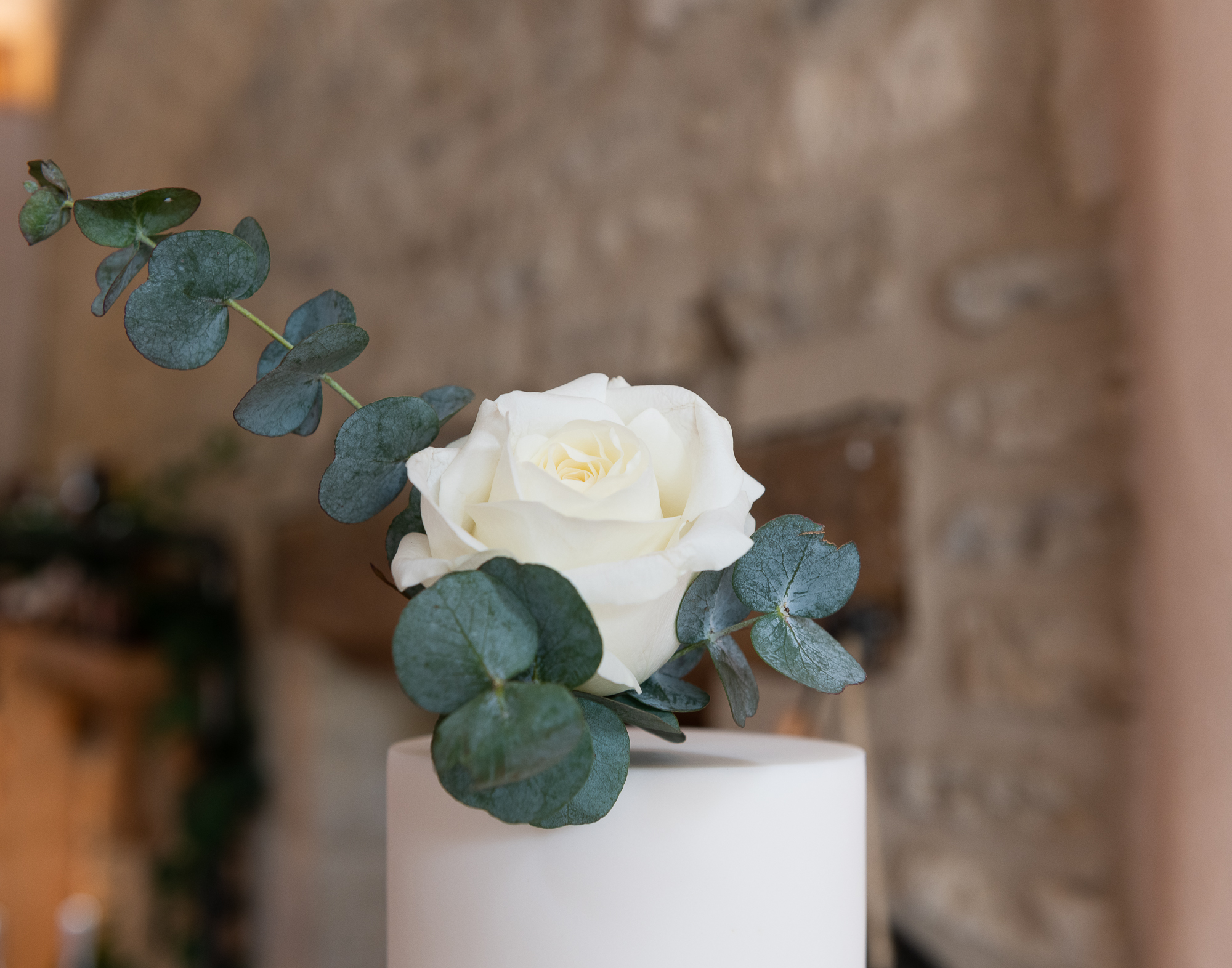An elegant 4 tiered iced cake with over 300 handmade ruffles on the bottom tier and edible glitter on the second tier. Set in the wonderful Oxleaze Barn.