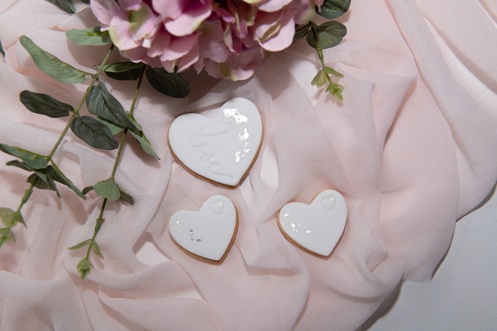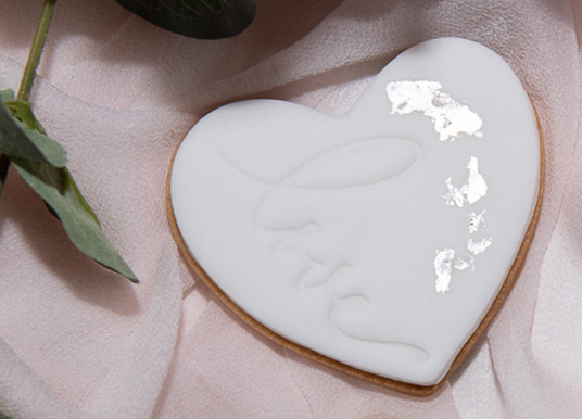 A delicious vanilla cookie with an elegant touch of edible silver leaf. Embossed with 'love'.